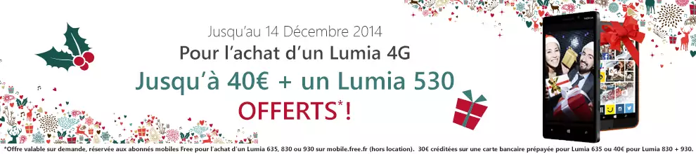 Une nouvelle offre plutôt intéressante vient d’être disponible sur la boutique Free Mobile. En effet, pour fêter Noël, Microsoft vous offre un Lumia 530 pour tout achat d’un Lumia 635, Lumia 735, Lumia 830 ou Lumia 930 effectué entre le 28/11/14 et le 14/12/14