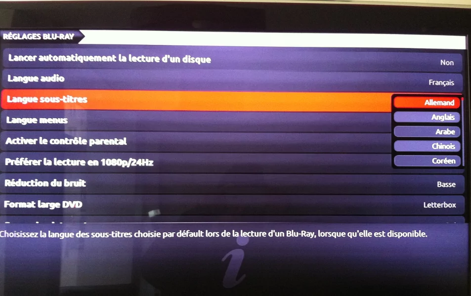 Le choix parmi une trentaine de langues vous permet de sélectionner la langue audio, les sous-titres et la langue du menu. Vous pouvez également remettre ces paramètres par défaut de façon à choisir automatiquement la version VO du Blu-Ray.