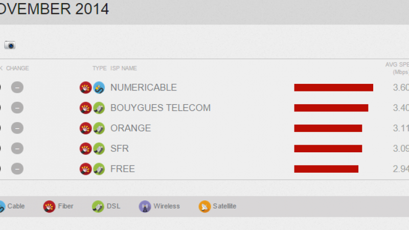 Néanmoins les évolutions restent légères d’un mois sur l’autre Free ayant perdu 0.05 Mbits en un mois. Numericable reste leader du classement français avec un débit moyen proposé de 3.60 Mbits. L’écart entre le premier et le dernier reste donc minime.