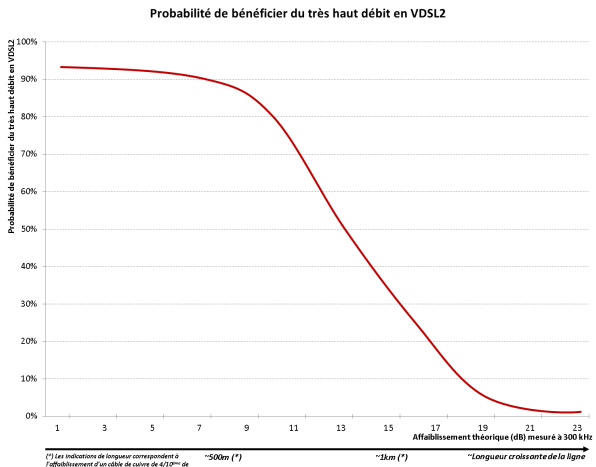 Cette étude, dont les résultats sont représentés sous forme de graphique ci-dessous, permet donc d’évaluer la probabilité de bénéficier du très haut débit au moyen du VDSL2 en fonction de l’affaiblissement de la ligne de cuivre considérée.