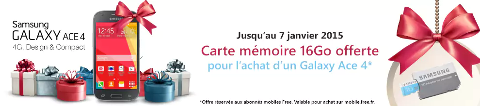 La boutique en ligne de Free Mobile vient de lancer une nouvelle offre « réservée aux abonnés Free ». Pour tout achat, jusqu’au 7 janvier, d’un Galaxy Ace 4, une carte mémoire de 16Go est offerte. Le Galaxy Ace 4 est proposé au tarif de 179 euros chez Free Mobile (ou en plusieurs mensualités sans frais).