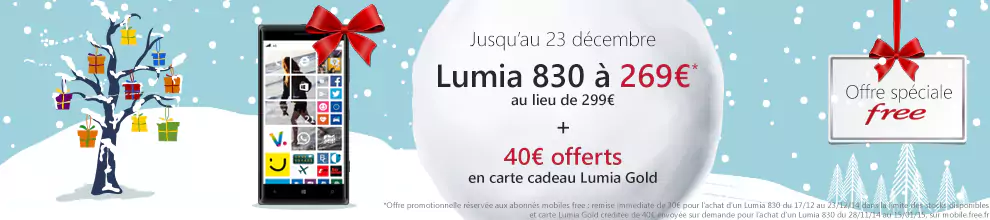 Une nouvelle offre réservée aux abonnés Free Mobile vient d’être lancée sur mobile.free.fr. Elle propose le Lumia 830 à 269 euros au lieu de 299 euros. A cela s’ajoutent 40 euros offerts en carte cadeau Lumia Gold (plus d’infos ici)