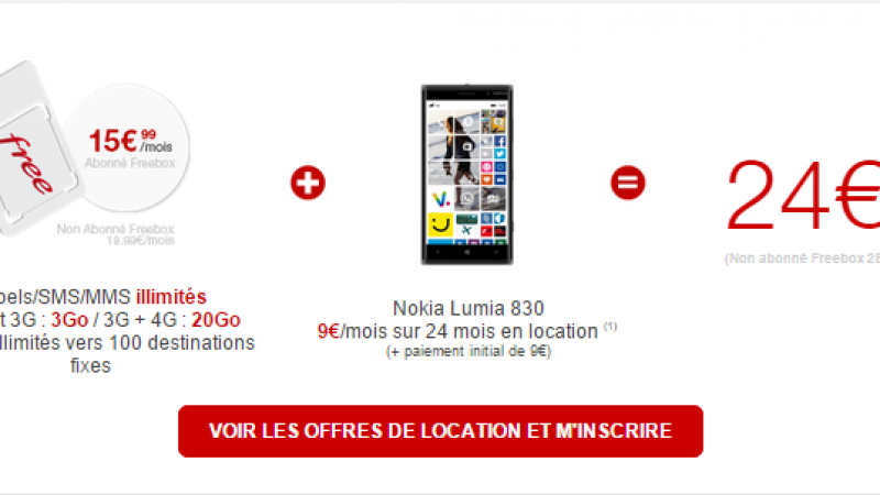 Le tarif le plus bas est proposé par le Nokia Lumia 830. Proposé à 9€/mois sur 24 mois et 9 € à la commande, l’offre de location en plus de l’abonnement revient à 24,99 €/mois sur 24 mois pour un abonné Freebox et 28,99 €/mois pour les non abonnés Freebox.