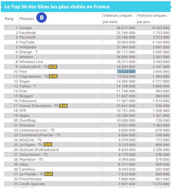Médiamétrie vient de publier l’audience de l’internet en France pour le mois de novembre 2014. Peu de changement dans le haut du classement où le retrouve les mêmes sites qu’en octobre. Google, Facebook Microsoft occupaient les 3 premières places en novembre. Orange, de son coté, reste le site télécom le plus visité et se classe 6ème. Enfin Free remonte en peu dans le cassement par rapport au mois précédent et passe de la 11ème à la 10ème place. Le domaine free.fr a totalisé 15 625 000 de visiteurs uniques en novembre.