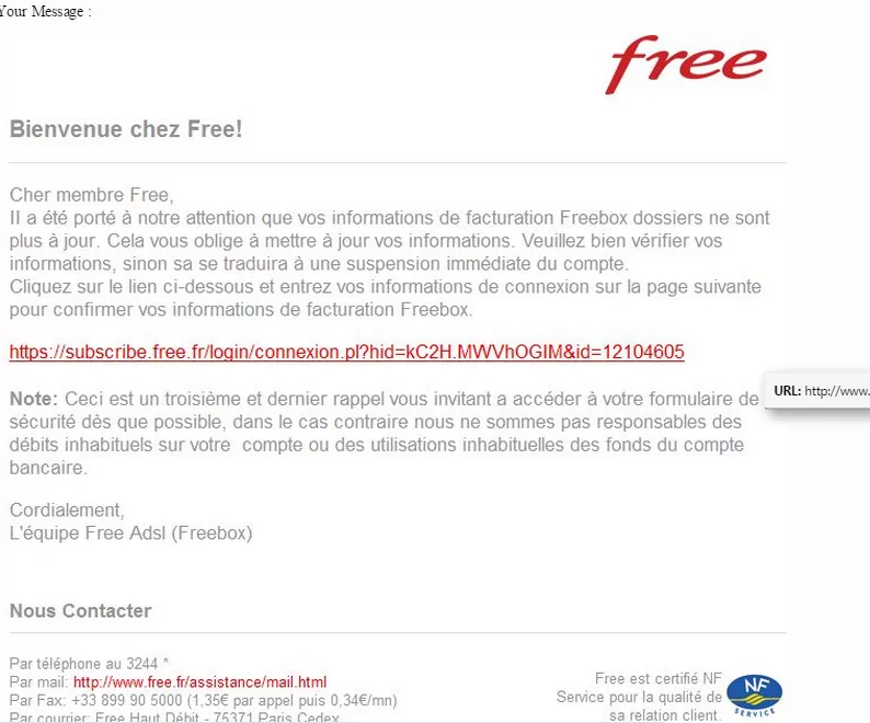 Une nouvelle attaque de type Phishing (hameçonnage) est en cours contre Free et les Freenautes. Une fois n’est pas coutume, un courriel (ou pourriel) subtilisant l’identité du fournisseur d’accès Free, et particulièrement mal rédigé, est envoyé dans les boites emails des abonnés. Le pirate informatique incite les Freenautes à visiter une page web page d’authentification de la console de gestion. Une fois les identifiant rentrés, il est directement demandé les informations bancaires. Ces dernières seront immédiatement transmises à des cyber-escros.