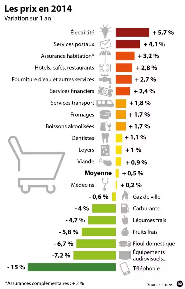 En 2014, la téléphonie a été le secteur qui a vu la plus gosse baisse de tarifs, et de loin. Comme on peut le constater sur l’infographie de l’Agence IDE, qui se base sur les chiffres de l’INSEE, les prix de la téléphonie ont baissé de 15%, très loin devant les équipements audiovisuels, avec -7,2%. A contrario, c’est l’électricité dont les tarifs ont le plus augmenté en 2014, avec +5,7%.
