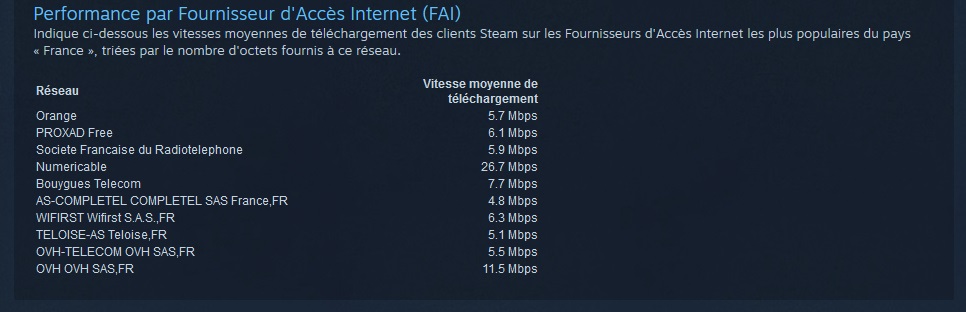 Mais la grosse nouveauté de Steam Global traffic Map’s, c’est les statistiques de débits moyens atteint par les abonnées pour chaque fournisseur d’accès à internet !