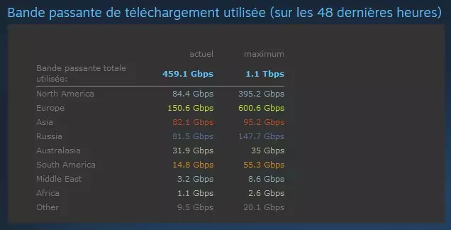 Pour la semaine passée, on observe que la France a donc téléchargé 2,5 Po de données (2 milliards de mégaoctets environs) pour une vitesse moyenne de 7,5 Mb/s ce qui représentait sur cette période 3 % de trafic mondial de Steam.
