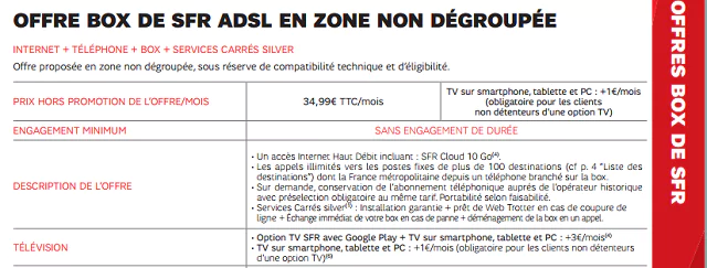 Pire encore, l’abonnement à 34,99 € en zone non-dégroupée, ne permet pas de disposer de la télévision sur la box. L’option à 1 € par mois y est quand même obligatoire.