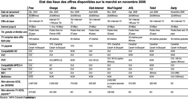 On peut en particulier retrouver le tableau de l’état des lieux des offres de TV par ADSL. Toutefois, comme le précise le CSA, il n’est pas évident de définir le nombre de foyers utilisant le service de télévision, les offres étant vendues en pack. Ne sont donc comptabilisés que les foyers abonnés à une chaîne TV ou utilisant le service de VOD. C’est ainsi que, même si Free compte plus d’1 millions de foyers pouvant bénéficier de la TV par ADSL, le CSA n’en retient que 273 000.