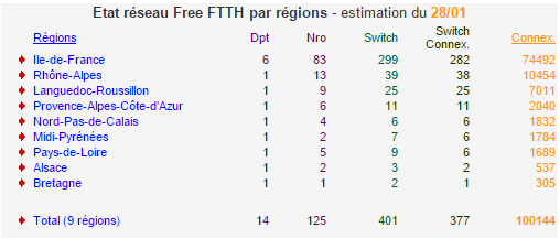 Selon les estimations de françois04, Free vient de passer la barre des 100 000 connexions FTTH sur les 125 NRO déployés par l’opérateur. Les 3/4 proviennent d’Ile de France avec 74 000 connexions, largement devant la region Rhone-Alpes avec 10 000 connexions. Le Languedoc Roussillon talonne la région Rhone-Alpes avec 7000 connexions.