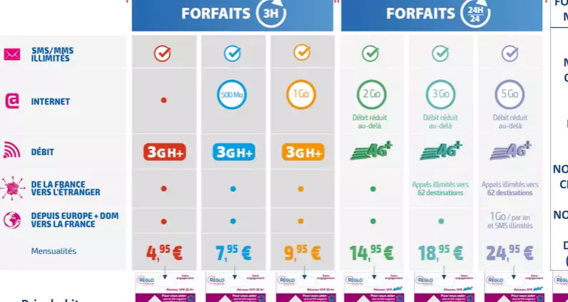 La gamme Réglo se décline désormais en 2 segments, selon que les appels soient limités à 3 heures ou illimités. Les offres commencent à 4,95 euros pour 3 heures d’appels avec SMS et MMS illimités sans internet, et vont jusqu’aux appels illimités avec 5 Go d’internet et appels illimités vers 62 destinations pour 24,95 euros. En prime, il est possible d’allonger son forfait d’une heure supplémentaire pour 2 euros, ainsi que 100 Mo pour 2 euros ou 500 Mo pour 5 euros. Les forfaits sont sans engagement et il faut compter 5 euros pour la carte SIM. Notez aussi que les forfaits de 3 heures ne sont compatibles qu’en 3G/3G++. Réglo Mobile est un MVNO sur le réseau SFR.