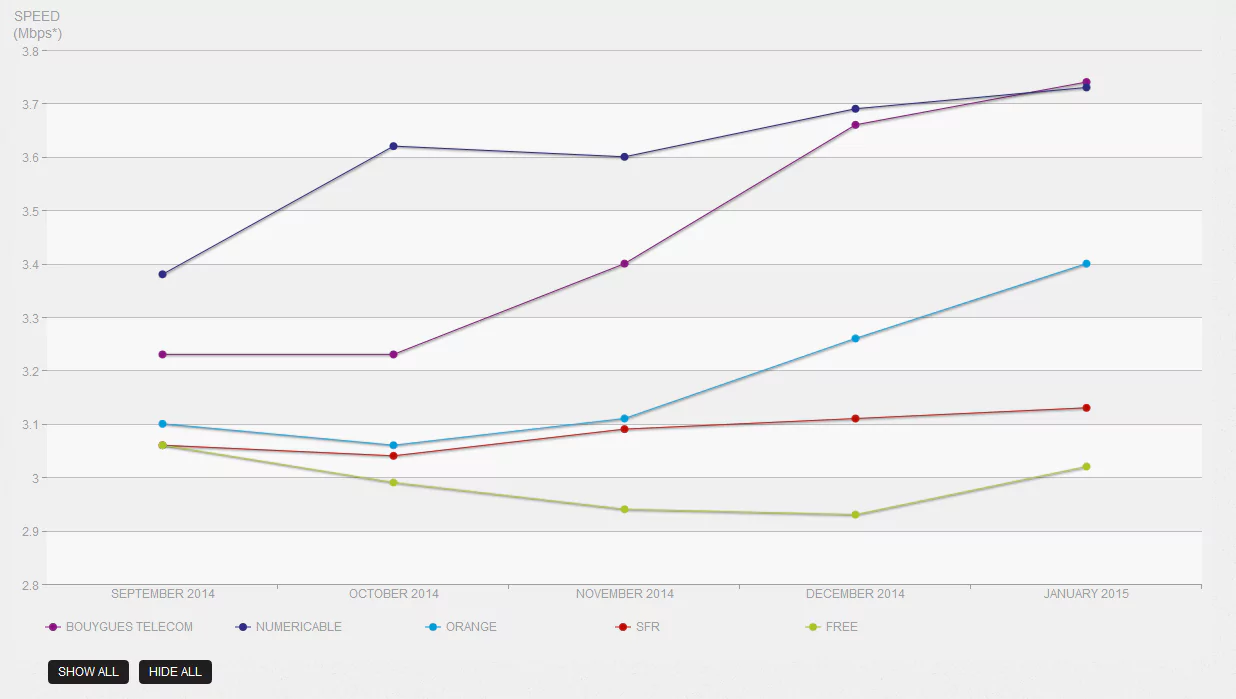 Pour la première fois depuis l’arrivée de Netflix en France, le podium se trouve changé, car Bouygues grille la première place que Numéricable avait depuis septembre. Globalement les vitesses moyennes augmentent pour chaque FAI, et Free crée la surprise après plusieurs mois en baisse, le quatrième opérateur qui était arrivé à 2,93 Mbps le mois dernier, parvient à remonter à 3,02 Mbps.
