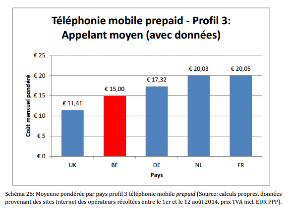 Sur les offres mobiles prépayées, la France est loin des prix pratiqués en Belgique et au Royaume Uni et se révèle plus cher sur quasiment l’ensemble des profils étudiés par le régulateur belge.