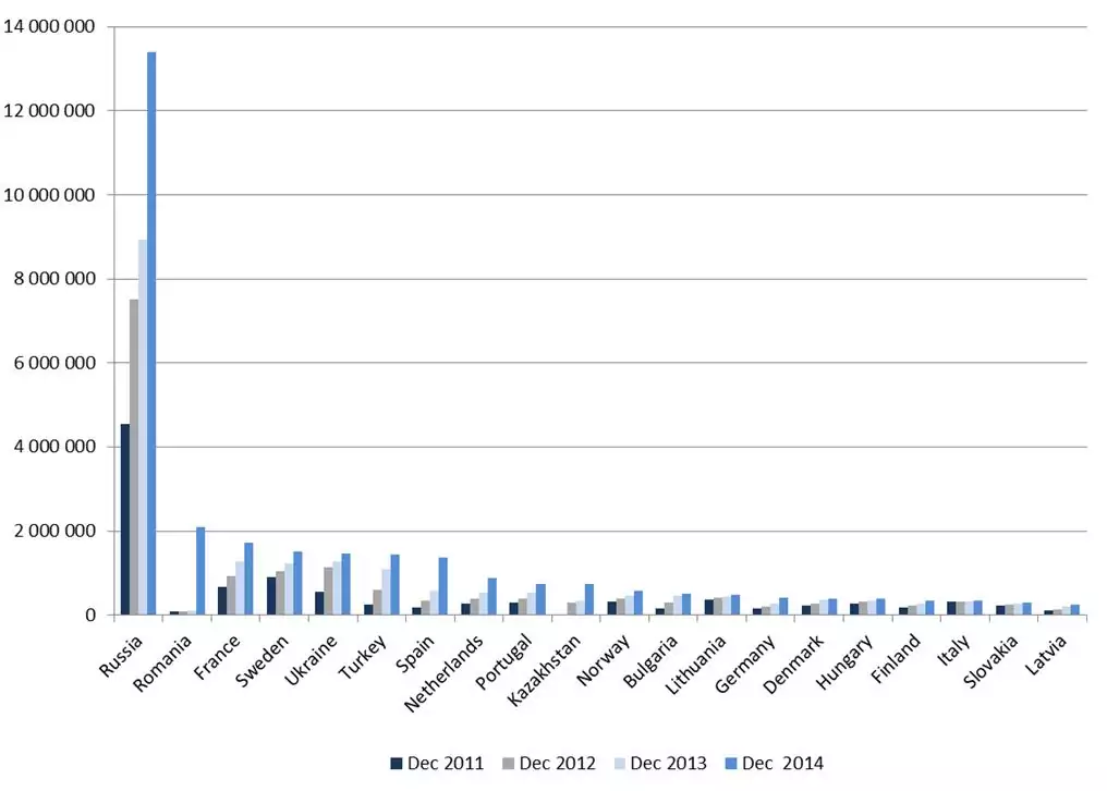 Un autre pays qui se distingue est la Roumanie, où les principaux acteurs ont décidé de changer leur stratégie en choisissant la technologie FTTH/B alors qu’ils avaient préalablement fait le choix d’une architecture FTTx/LAN. Le nombre d’abonnés a considérablement augmenté, tout en prenant en compte le taux de churn des utilisateurs finaux. Ces deux pays notables sont suivis par la France, la Turquie et les Pays-Bas pour lesquels on enregistre, respectivement, une croissance des abonnés en 2014 de 25%, 24% et 39%.