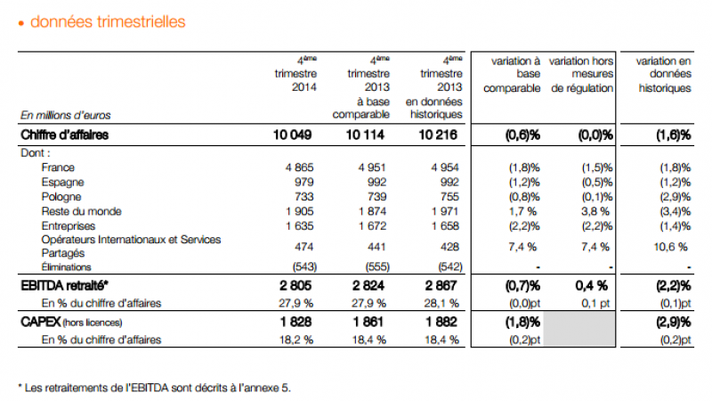 Orange publiait ce matin ses résultats annuels pour l’année 2014 et par la même occasion ses résultats concernant le 4e trimestre 2014.
