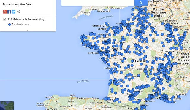 Au dernier pointage, 707 bornes Free Mobile étaient installées dans les presse Mag et Maison de la Presse. En 3 semaines se sont 41 nouvelles bornes qui ont été installées. Désormais ce sont 748 bornes automatiques Free Mobile qui sont accessibles dans les enseignes Presse Mag et Maison de la Presse.