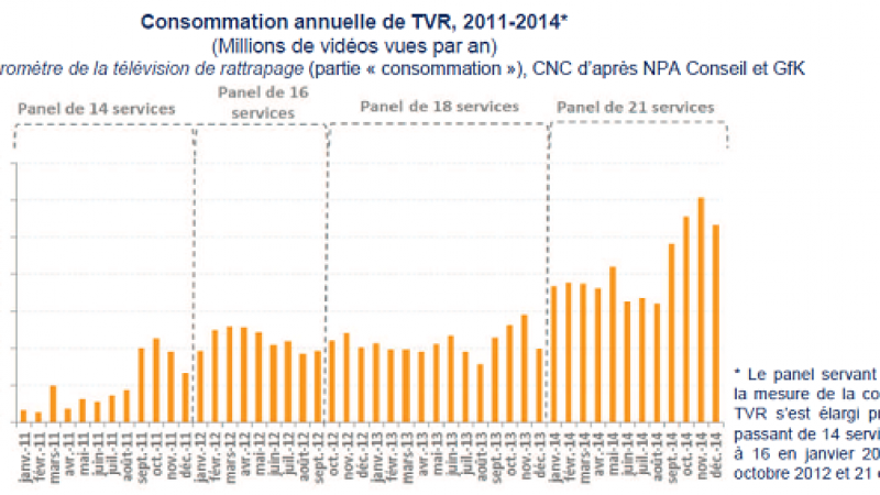Sur 5 contenus de télévision en ligne regardés en 2014, plus de 4 étaient des programmes visionnés en replay. La consommation de rattrapage dépend surtout de l’offre qui est faite. Les programmes de stock sont très présent, avec 46 % de vidéos vues chaque mois en moyenne. Dans ces programmes de stock, qui regroupe les films du cinéma, les documentaires et la fiction, cette dernière est le programme le plus vue chaque mois en replay, alors qu’elle ne représente que 8 % du nombre d’heures disponibles en rattrapage chaque mois.
