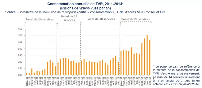Sur 5 contenus de télévision en ligne regardés en 2014, plus de 4 étaient des programmes visionnés en replay. La consommation de rattrapage dépend surtout de l’offre qui est faite. Les programmes de stock sont très présent, avec 46 % de vidéos vues chaque mois en moyenne. Dans ces programmes de stock, qui regroupe les films du cinéma, les documentaires et la fiction, cette dernière est le programme le plus vue chaque mois en replay, alors qu’elle ne représente que 8 % du nombre d’heures disponibles en rattrapage chaque mois.