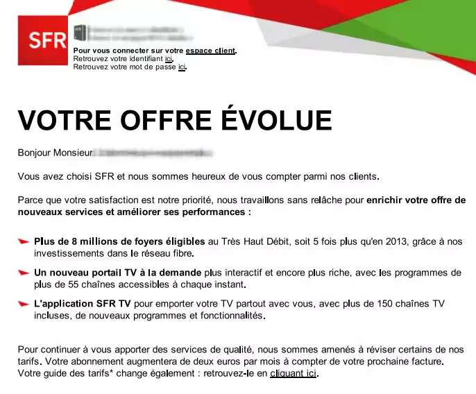 SFR a confirmé aujourd’hui l’augmentation aux premiers abonnés concernés, en leur envoyant un mail explicatif :