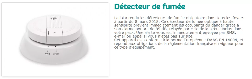 Désormais sera donc inclus dans l’offre Home un dispositif de sécurité complet avec un détecteur de fumée. Celui-ci sera bien sûr homologué DAAS EN 14-604 comme le veut la norme européenne.