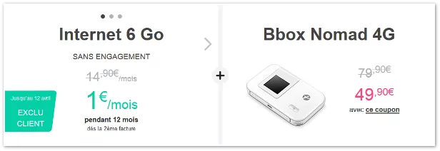 Valable jusqu’au 12 avril prochain, l’offre est réservée aux clients forfait Bouygues Télécom, B&You ou Bbox (à titre non professionnelle) pour un Forfait Bbox Nomad 6Go sans engagement.
