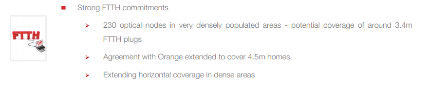 Il dispose également d’un accord de co-investissement avec Orange pour étendre sa couverture à 4,5 millions de foyers. Sur l’exercice 2014, le Groupe a intensifié sa participation au cofinancement du déploiement en dehors des Zones Très Denses, en s’engageant sur 20 communes supplémentaires représentant 0,4 millions de logements.