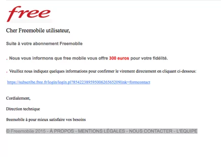 Régulièrement, certains mails malveillants dans votre boite de réception peuvent prêter à confusion. Un nouveau phishing est en cours, se faisant passer par Free Mobile. Ce dernier prétend vous offrir 300€, moyennant le remplissage de quelques informations complémentaires. Le mail renvoie sa potentielle victime vers un site miroir de Free Mobile.