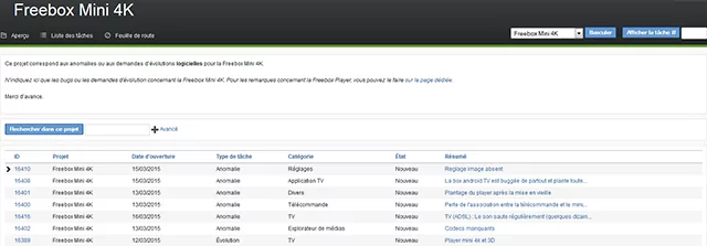 Le bugtracker de la Freebox mini 4K est ouvert, celui-ci permet aux abonnés de signaler les problèmes et bugs rencontrés directement aux développeurs. Aussi, il est possible de proposer des idées d’évolution logicielle. :lsdexception>