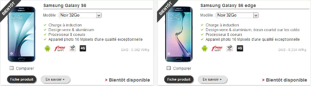 Les Samsung Galaxy S6 et Samsung Galaxy S6 Edge seront bientôt disponibles chez Free Mobile. L’opérateur vient tout juste de l’indiquer dans sa boutique en ligne, à travers un bandeau. Le dernier né de Samsung sera proposé en plusieurs couleurs (Noir, Blanc et Or), en version 32Go.
