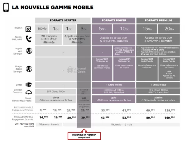 Sans grande surprise, les forfaits Mobile sont soumis à un engagement de 12 mois (sans mobile) à 24 mois (avec mobile), pour des prix variant de 9,99 euros par mois à 149,99 euros par mois (hors promotion). L’offre « Starter 100 Mo » à 9,99 euros (sans mobile avec 12 mois d’engagement) propose 2h d’appels, les SMS/MMS illimités et 100 Mo de data. Le forfait « Premium 20Go » à 149,99 euros (mobile avec 24 mois d’engagement) contient quant à lui les appels illimités, les SMS/MMS illimités, 20Go de data et plusieurs services (roaming, 1 extra inclus, SFR Cloud 100Go…).