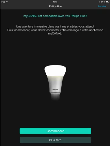 1/ Ouvrez l’appli myCanal. A la détection de votre éclairage Hue, l’écran d’appairage s’affiche. Touchez « Commencer ».