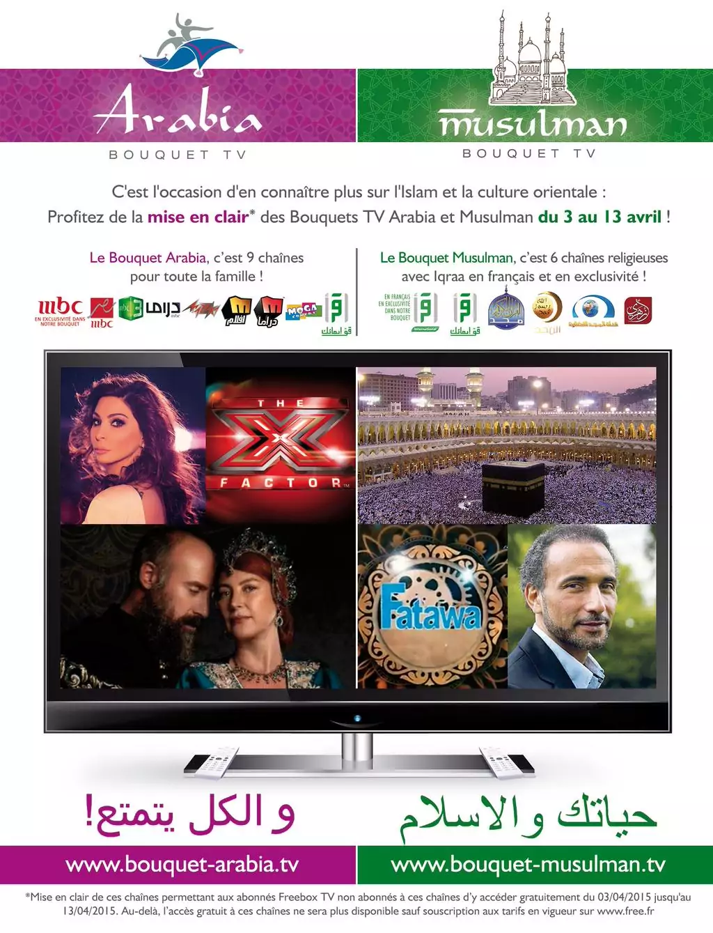 Nous vous informions en début d’après midi que les deux bouquets « Arabia » et « Musulman » sera mis au clair en avril. Le compte Twitter de l’Aktu Freebox confirme cet après midi l’information et précise les dates. Les deux bouquets seront disponibles gratuitement du vendredi 3 au lundi 13 avril inclus.