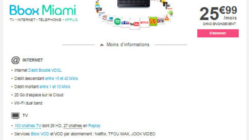 Alors que Bouygues Télécom a ouvert le 23 mars les abonnements de sa Bbox Miami à tous, l’opérateur a dans le même temps de mis fin à la Bbox Sensation. Elle en subsistera cependant dans un seul cas, en FTTLA (via le réseau Numéricable), technologie avec laquelle la Bbox Miami n’est pas compatible. Bouygues Télécom a confirmé l’information à Satellifax, mais dès à présent, l’offre Bbox Sensation n’est plus proposée lorsque l’on teste l’éligibilité d’une ligne qui n’est pas en zone FTTLA :