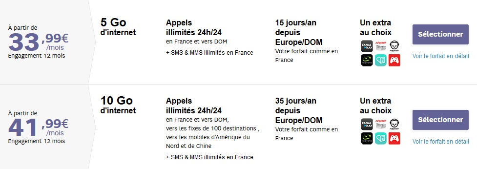 Les offres de la gamme « Power » proposent les appels, SMS et MMS illimités et 5 Go ou 10 Go d’internet pour respectivement 33,99 euros et 41,99 euros avec engagement de 12 mois (43,99 euros et 53,99 sans engagement). Ces forfaits proposent aussi 15 jours ou 35 jours de roaming depuis l’Europe et les doms. Un petit bonus « Extra » est inclus.