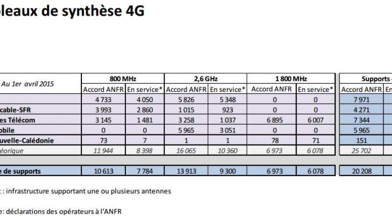 Comme chaque mois, l’Agence Nationale des Fréquences publie son bilan mensuel des déploiements 3G/4G des opérateurs télécoms. Au 1er avril 2015, l’ANFR recense ainsi plus de 20 000 sites autorisés à émettre en 4G.