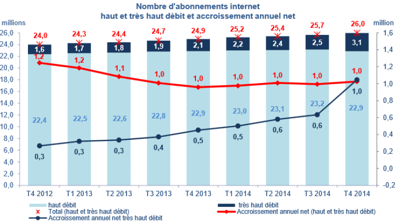 La consommation en services de communications électroniques et les abonnements demeurent très dynamiques. Tous deux sont en nette progression, en particulier pour les services à haut et très haut débit. Le nombre d’abonnements internet à haut et très haut débit fixes augmente de 4,1% en un an et s’élève à 26,0 millions au 31 décembre 2014. L’ensemble de cette croissance est portée par les accès à très haut débit, qui progressent d’un million en un an pour atteindre 3,1 millions d’abonnements au 31 décembre 2014, soit 12% des accès à internet.