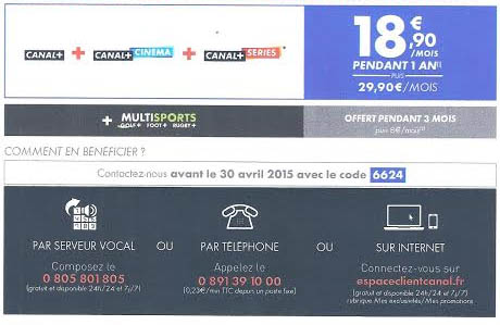 Autre information annoncée dans le courrier envoyé par Canal, un nouveau bouquet qui ne comporte que les 3 chaînes Canal+ sus-citées, pour un tarif mensuel inférieur à celui du bouquet complet. L’offre Canal+, Canal+ Cinéma et Canal+ Série est ainsi proposée à 18,90 euros par mois durant un an puis 29,99 euros par mois.