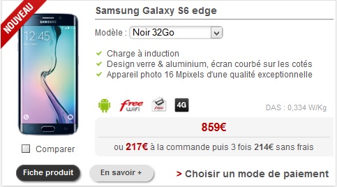 Le Samsung Galaxy S6 Edge est proposé dans sa version 32 Go dans deux coloris pour le moment, disponible en paiement comptant à 859 euros, ou en paiement 4x sans frais à 217 euros à la commande, et 214 mensuels.