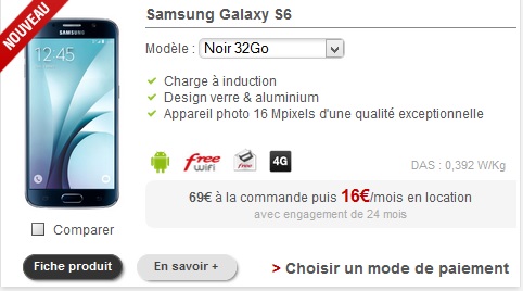 Le Samsung Galaxy S6 quant à lui est proposé dans les trois coloris noir, blanc ou or dans sa version 32 Go. Celui-ci est proposé en paiement comptant à 709 euros, ou en paiement 4x sans frais à 178 euros à la commande, puis 178 euros par mois. Le Galaxy S6 est aussi proposé en location 24 mois, moyennant 69 euros à la commande, puis 16 euros par mois.