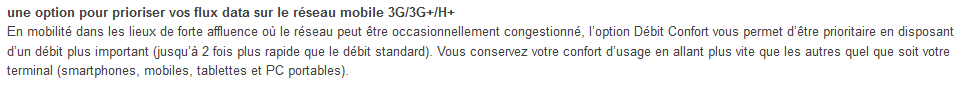 Orange explique sur son site internet, qu’en mobilité « dans les lieux de forte affluence où le réseau peut être occasionnellement congestionné, l’option Débit Confort vous permet d’être prioritaire en disposant d’un débit plus important (jusqu’à 2 fois plus rapide que le débit standard). Vous conservez votre confort d’usage en allant plus vite que les autres quel que soit votre terminal (smartphones, mobiles, tablettes et PC portables) ».