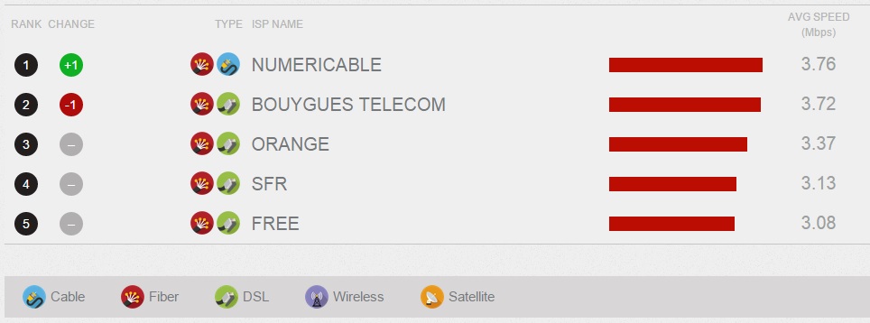 Comme chaque mois, Netflix publie son ISP Speed Index, qui mesure la vitesse moyenne de ses flux selon les pays et les opérateurs. Pour ce mois de mars, Numericable repasse en tête du classement, la faute à Bouygues Telecom qui laisse sa place en perdant 0.6 MBs par rapport au mois précédent.