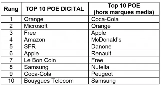 Les autres opérateurs figurent également dans ce classement. Orange est leader du TOP10 POE Digital, SFR se retrouve 5e et Bouygues 10e.