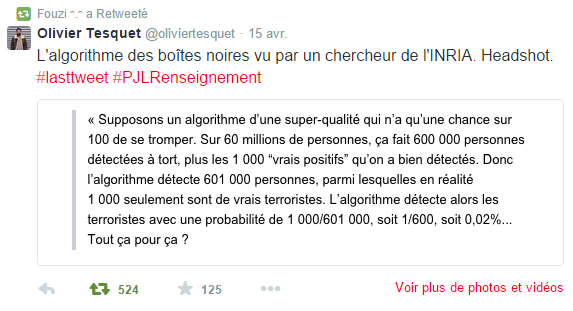 Un peuple prêt à sacrifier un peu de liberté pour un peu de sécurité ne mérite ni l’une ni l’autre, et finit par perdre les deux disait Benjamin Franklin. Pour rappel, le projet de loi étend les dispositions existantes en matière d’interceptions de sécurité et d’accès aux données de connexion. Il transpose dans le domaine de la prévention des techniques de recueil de renseignement (balisage de véhicules ou d’objets, sonorisation ou captation d’images dans des lieux privés, captation de données informatiques, écoutes téléphoniques…). Il permettra également un accès aux réseaux des opérateurs de télécommunications et aux serveurs des hébergeurs, en instaurant un mécanisme de détection d’un nouveau genre via des algorithmes (boîtes noires).