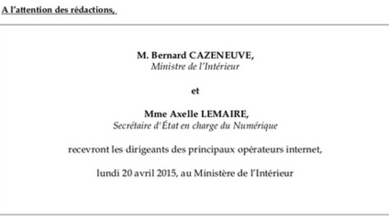 Les dirigeants des principaux opérateurs débattront autour du projet de loi relatif au Renseignement, dont le texte doit encore être voté définitivement à l’Assemblée Nationale le 5 mai 2015, puis au sénat. Un point presse est prévu à 17h15 durant lequel le gouvernement expliquera qu’il est attaché à soutenir la compétitivité de ce secteur qui crée des emplois dans notre pays et qui repose sur la confiance des abonnés. Mais aussi, qu’il est attaché aux libertés individuelles, etc.