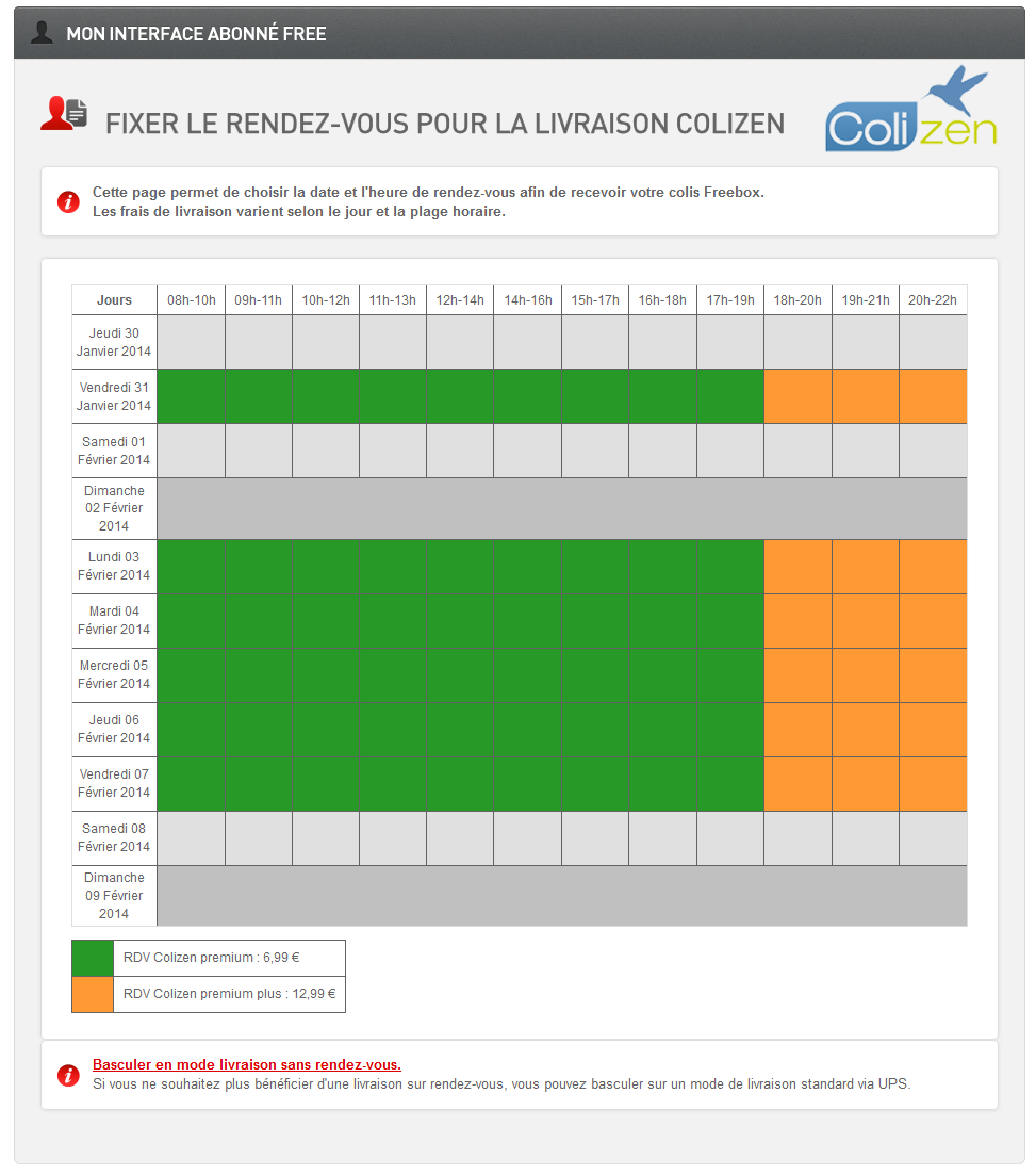Après la validation de votre inscription par France Telecom, vous recevez un lien qui redirige vers un planning avec les créneaux disponibles + prix. Il suffit de sélectionner son heure idéale et de patienter jusqu’à la livraison. Il est bien sûr à tout moment possible de repasser gratuitement par UPS pour la livraison (via le planning ou en cas de non prise de RDV).