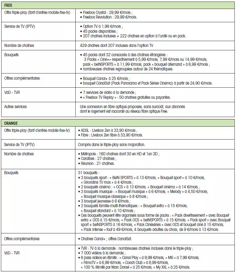 Même si les principales chaînes sont identiques chez tous les opérateurs, on peut néanmoins constater des larges différences. Ainsi free arrive largement en tête en ce qui concerne le nombre de chaînes totales avec 429 chaînes disponibles en tout.