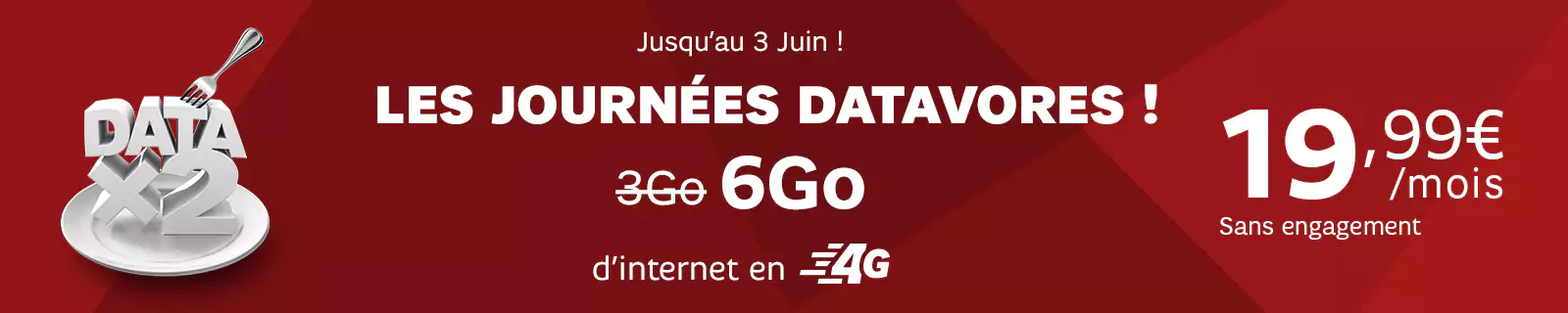 Les forfaits sont proposés à leurs prix habituels – respectivement 19,99 et 25,99 euros – mais l’enveloppe data était doublée, soit 6 et 10 Go. Pour 19,99 euros ou 25.99 euros, les forfaits incluent les appels, SMS/MMS illimités et une enveloppe data doublée, soit 6 Go ou 10 Go en 4G. Le forfait à 25,99 euros par mois propose notamment 5 Go/an en Europe et dans les DOM, ainsi que les SMS illimités depuis l’Europe et les DOM.