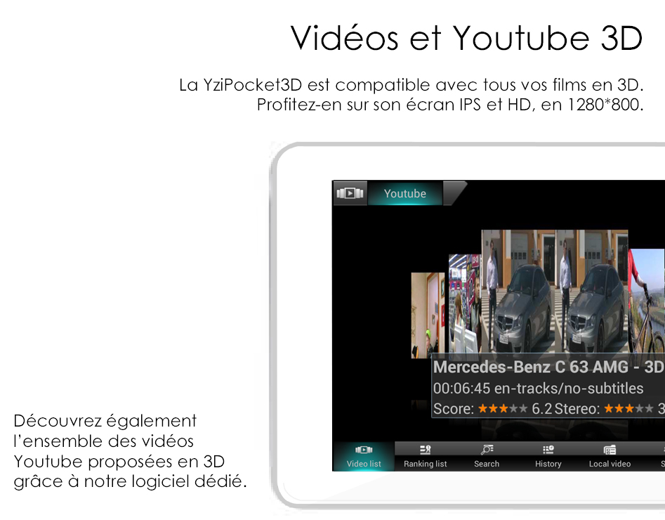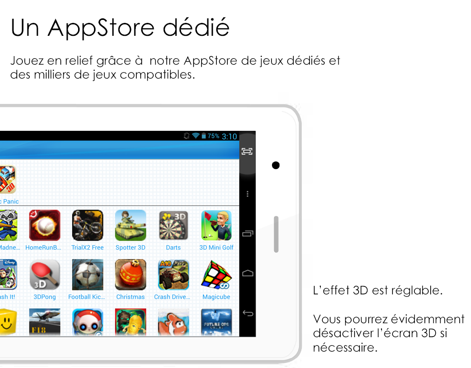 La YziPocket3D est une tablette 7 pouces sous Android équipée d’un processeur Quad-Core (Allwinner A31S) à 1.5Ghz, de 8Go de mémoire et 1Go de RAM. Avec cette tablette, il est possible de visualiser des films en 3D, mais également des photos ou bien de jouer à des jeux vidéo.EVI livre en effet des logiciels dédiés et un AppStore disposant de milliers de jeux compatibles avec l’écran 3D.