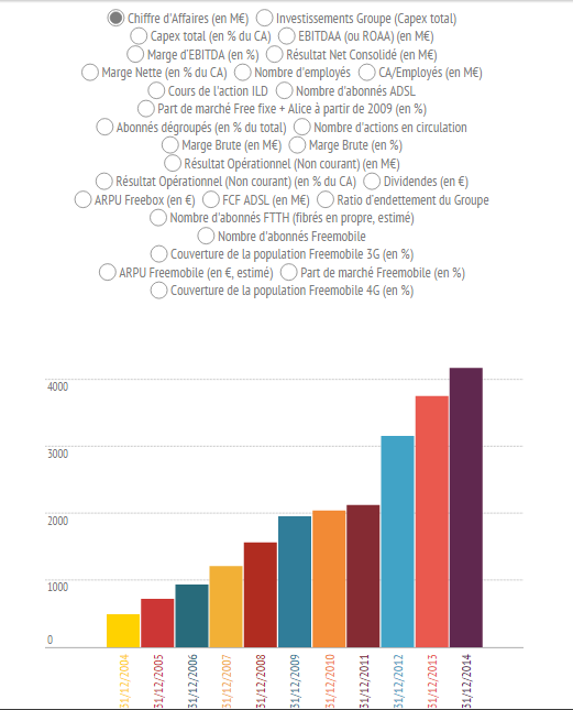 Sur une seule page, il est ainsi possible de découvrir la progression du nombre d’employés, d’abonnés fixes et mobiles, ou encore le chiffre d’affaires, le résultat net au cours de ces dernières années, la couverture mobile, etc… On peut y apprendre notamment que le nombre d’employés du groupe Iliad a presque décuplé en 11 ans.